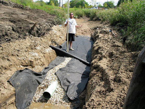 WaterproofingWe only do EXTERIOR water control.Why limit it? Because we believe it is better to keep the water out in the first place then to invite it in and pump it back out. Once the water infiltrates your house it can bring with it-mold, mildew and all those other fun things people don't necessarily want to live with. We approach every water infiltration problem with a "common sense" style. First thing - LOOK UP! - Do you have gutters and proper down spout extensions in place. If not this is a good place to start. You need to keep the water as far away from your house as possible. Next - LOOK DOWN! - Is the grade or ground sloping right into your house? If so this where Genadek Landscaping & Excavating Inc will begin. We offer 3 options to control exterior water from entering your building.